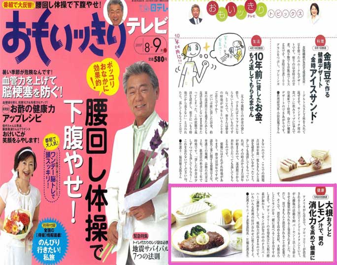 「おもいッきりテレビ8-9月号」企画「おもいッきりテレビトピックス」の中で、衣理クリニック表参道(エリクリニック)院長 片桐衣理が番組出演(5/22放送)時に紹介した情報「胃の消化力を高めて健康に!」が掲載されています。