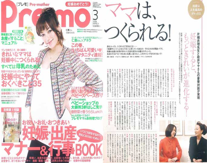 「プレモ3月号」企画「きれいなママは妊娠中につくられる!」にて、衣理クリニック表参道(エリクリニック)院長 片桐衣理が政井マヤさんと対談しました。自身の経験、妊娠中の肌や髪、ホルモンバランスの変化等について語っています。また、妊娠中の様々なお悩みにアドバイスしています。