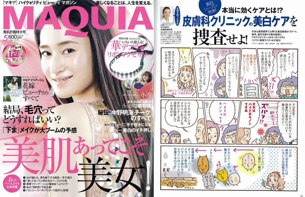 『MAQUIA』5月号、「皮膚科クリニックの美白ケアを捜査せよ!」にて、衣理クリニック表参道院長 片桐衣理が、効果的な美白ケアについてコメントさせていただきました。その一つとしてハイドロキノンをご紹介しております。是非ご覧下さいませ。
