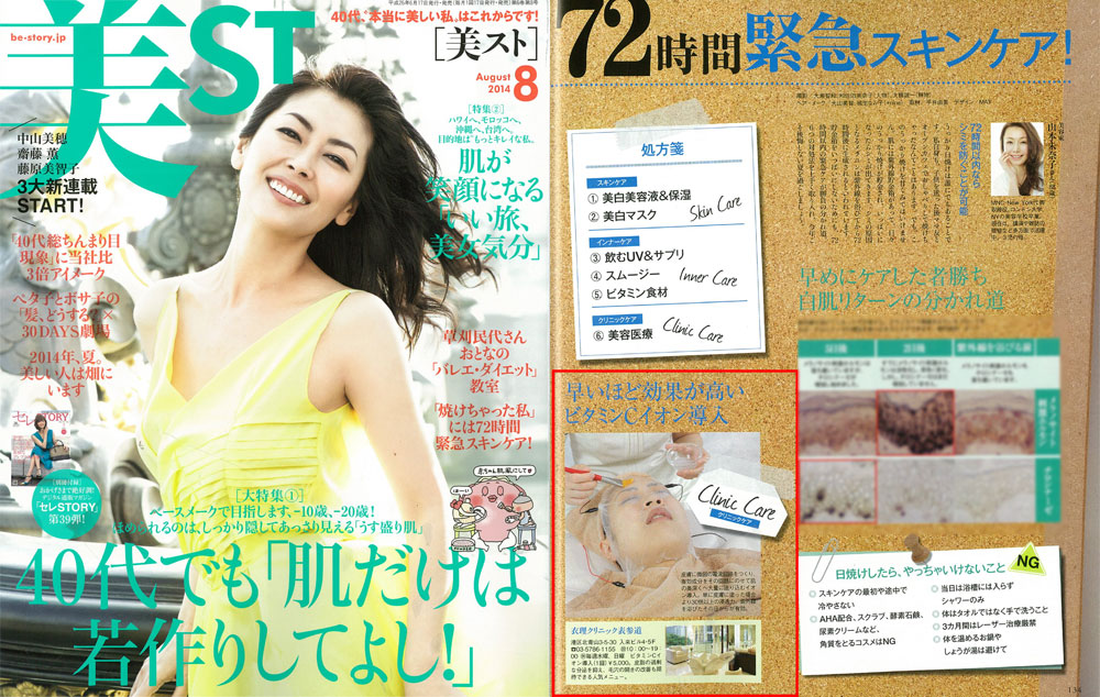『美ST』8月号、【「焼けちゃった私」には72時間緊急スキンケア!】にて、美容家の山本未奈子さんが、衣理クリニック表参道の「ビタミンCイオン導入」をご紹介くださいました。是非、ご覧下さいませ。
