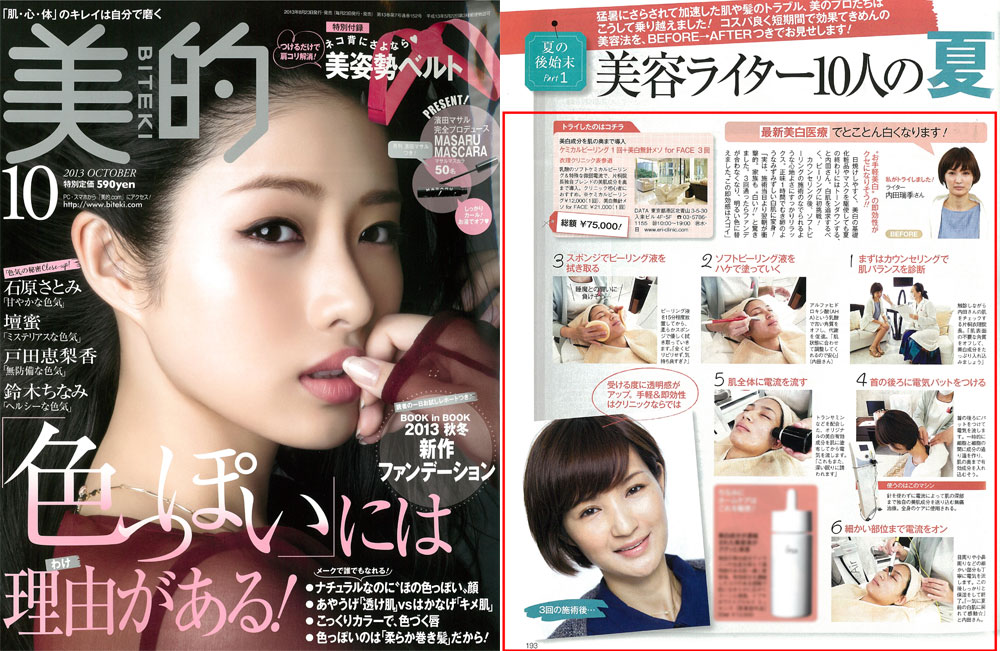 『美的』10月号、「美容ライター10人の夏ダメージ復活劇」にて、衣理クリニック表参道の『ケミカルピーリング』と『無針メソ for FACE(美白)』が紹介されました。ライターの内田瑞季さんにご体験いただいた様子が掲載されております。「この即効性はスゴイ」とのお言葉もいただきました!是非、ご覧下さいませ。