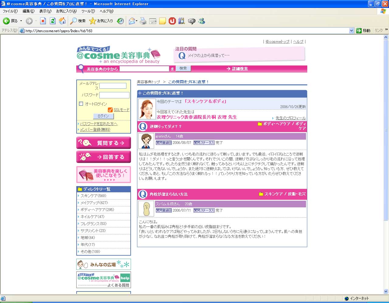@cosme美容事典「この質問をプロに直撃!」の中で、衣理クリニック表参道(エリクリニック)院長 片桐衣理がコスメや美容の様々な疑問・お悩みにお答えしています。今回のテーマは「スキンケア&ボディ」です。