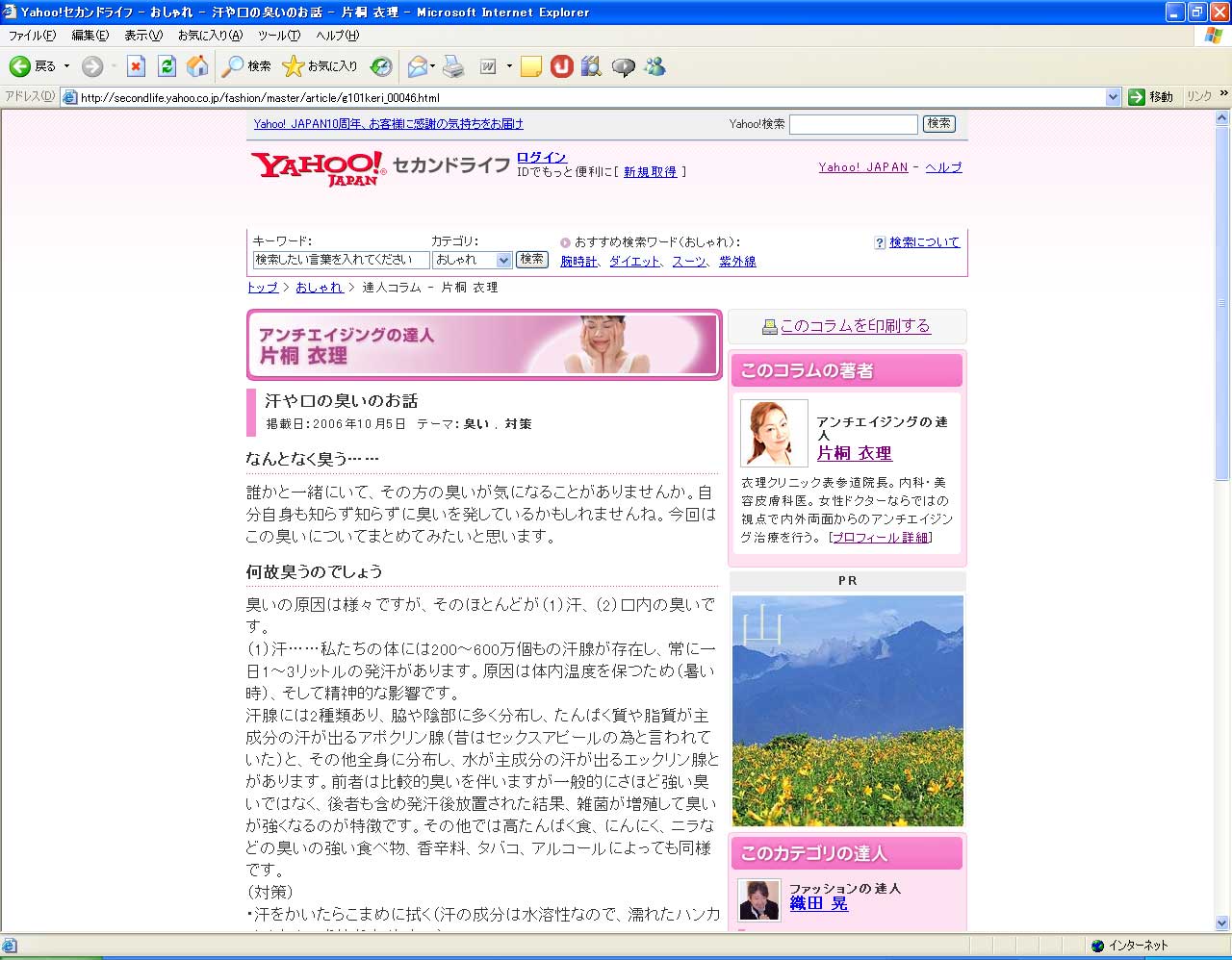 「Yahoo!セカンドライフ」にて“アンチエイジングの達人”として、衣理クリニック表参道(エリクリニック)院長 片桐衣理がコラムを連載しています。10月のテーマは、「汗や口の臭いのお話」です。