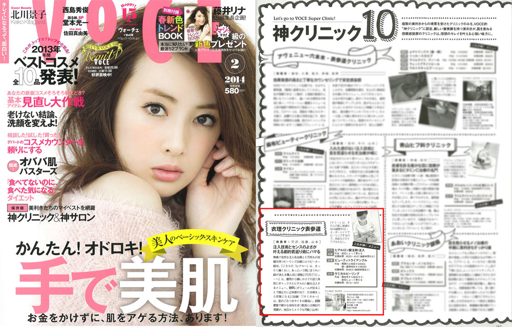 『VoCE』2月号、「神クリニック×神サロン」にて、神クリニックベスト10に、衣理クリニック表参道が選ばれました。「ヒアルロン酸注射・注入」、「ビューティトライアングル」、「ケミカルピーリング」をおすすめ頂いております。是非ご覧くださいませ。