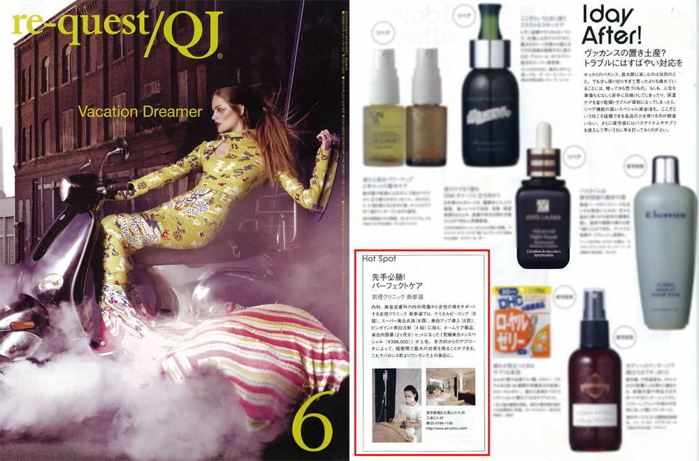 『re-quest/QJ』6月号、「After Vacation」に、バカンス後のマストビューティとして衣理クリニック表参道が掲載されました。当院人気メニュー「究極美白メソスペシャル」をご紹介しております。是非ご覧下さいませ。