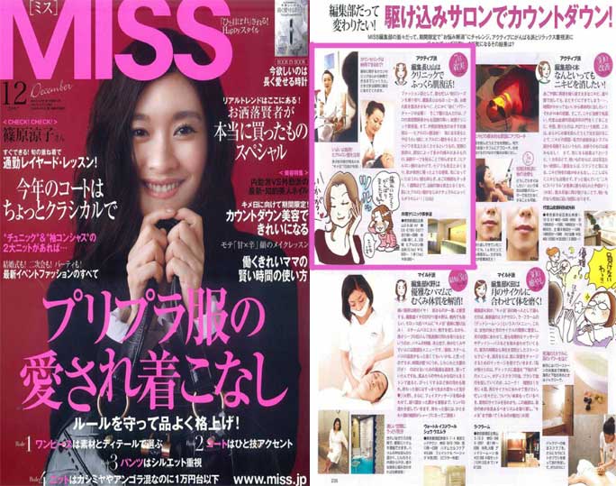 「MISS12月号」企画「カウントダウン美容できれいになる!」の中で、“キメ日”に向けて短期間で変身できる「駆け込みサロン」として衣理クリニック表参道(エリクリニック)が紹介されています。MISS編集長が当院のヒアルロン酸注射を体験レポートしています。