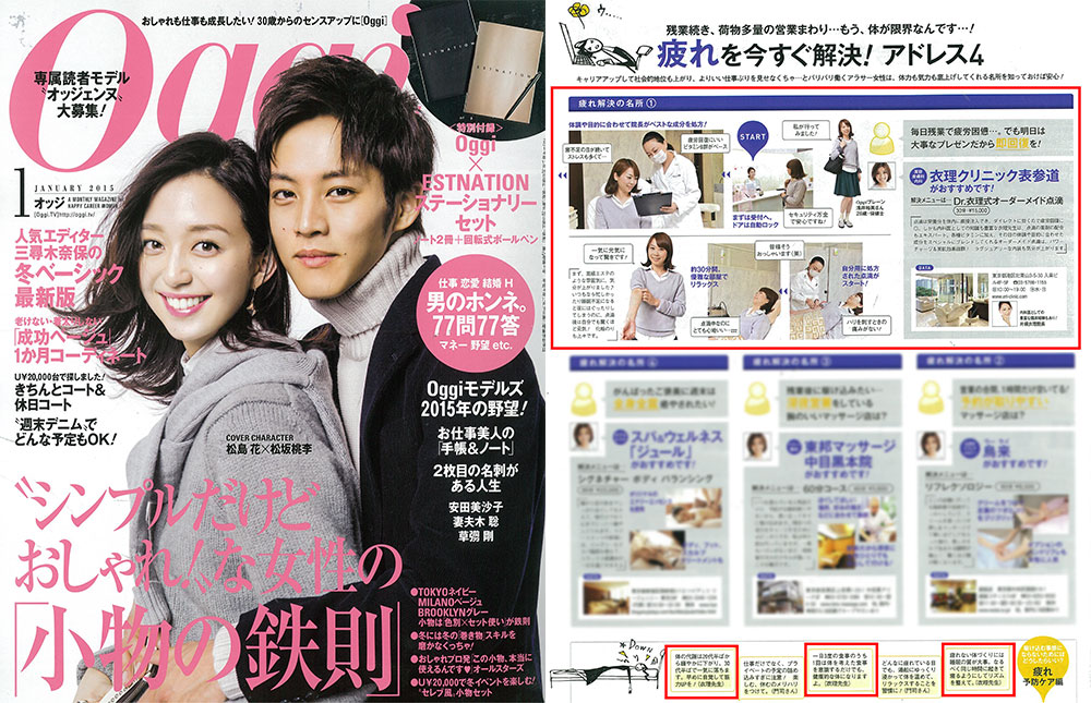 『Oggi』1月号、「働く女性の“美のピンチ”を救う、Oggi的駆け込みアドレス」にて、エディター 門司紀子さんより当院の『Dr.衣理式オーダーメイド点滴』をご紹介いただきました。また、院長 片桐衣理が、疲れ予防ケアについてコメントさせていただきました。是非、ご覧下さいませ。