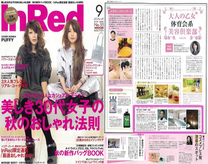 「InRed9月号」企画「大人の乙女 体育会系美容倶楽部」にて、倉田真由美さんオススメのスポットとして衣理クリニック表参道(エリクリニック)が掲載されました。また、当院のプラセンタ療法について紹介されています。
