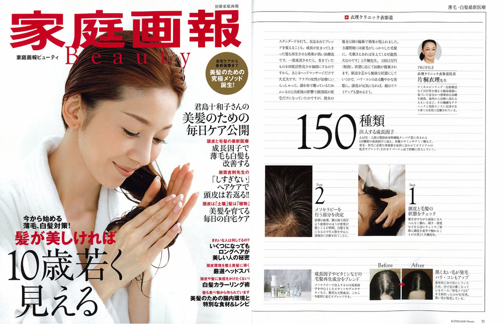 『家庭画報Beauty』12月号、「薄毛・白髪最新医療」にて、女性の薄毛について院長 片桐衣理がコメントさせて頂きました。また、治療として「育毛メソEX」をご紹介させて頂きました。是非、ご覧下さいませ。
