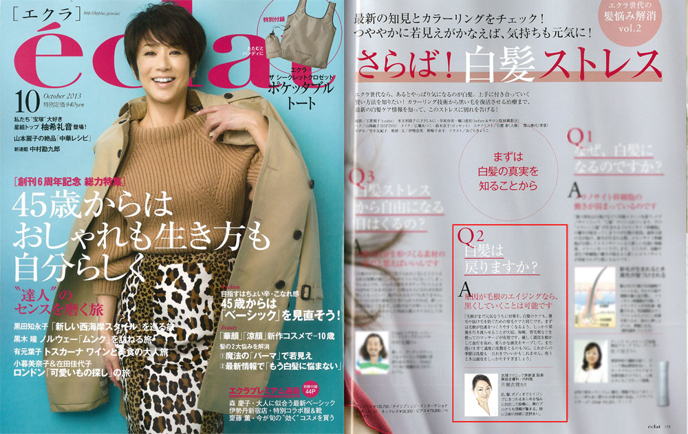 『eclat』10月号、「さらば!白髪ストレス」にて、衣理クリニック表参道院長 片桐衣理が、白髪の疑問についてコメントさせて頂きました。また、ケアとして、『育毛メソセラピー』と『パントガール』をご紹介しております。是非、ご覧下さいませ。