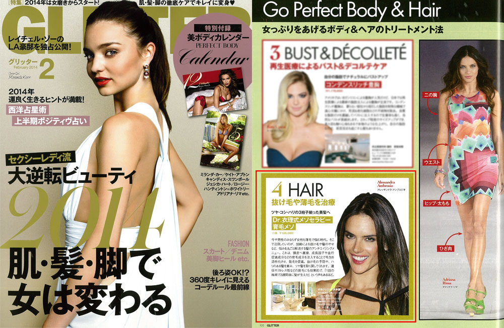 『GLITTER』2月号、「進化する美容医療でどこまでも美しく」にて、抜け毛や薄毛の治療として衣理クリニック表参道の「Dr.衣理式メソセラピー(育毛メソ)」をご紹介頂きました。是非、ご覧くださいませ。