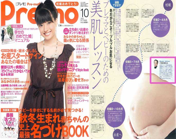 「プレモ10月号」企画「プレママとベビーのための美肌レッスン」の中で、衣理クリニック表参道(エリクリニック)院長 片桐衣理が「妊娠中もプルプル肌でいるためのスキンケア、ボディケアについて」アドバイスしています。また、イースペシャル・モイスチャージェルとアクティブクリームが紹介されています。