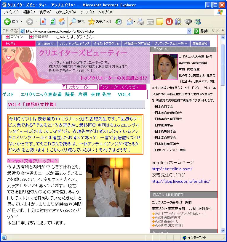 アンチエイジャーの企画「クリエイターズビューティ」ゲストとして4回に渡り、衣理クリニック表参道(エリクリニック)院長 片桐衣理のインタビュー記事が掲載されました。最終回のテーマは「理想の女性像」です。
