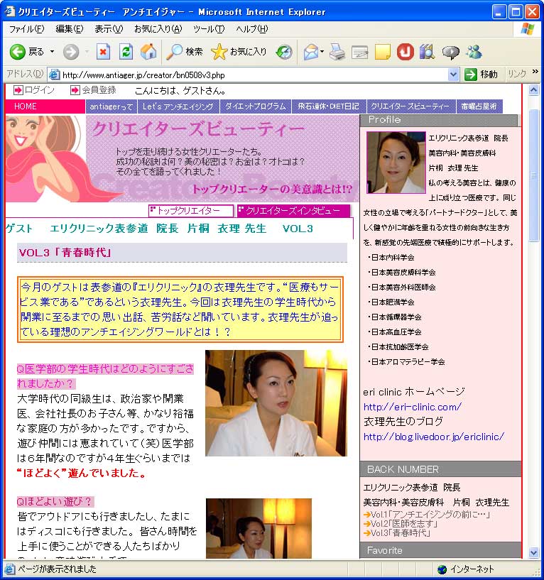 アンチエイジャーの企画「クリエイターズビューティ」ゲストとして4回に渡り、衣理クリニック表参道(エリクリニック)院長 片桐衣理のインタビュー記事が掲載されました。第3回のテーマは「青春時代」です。