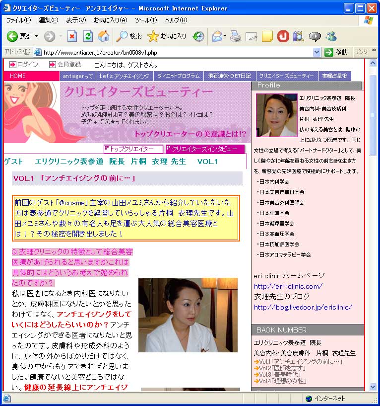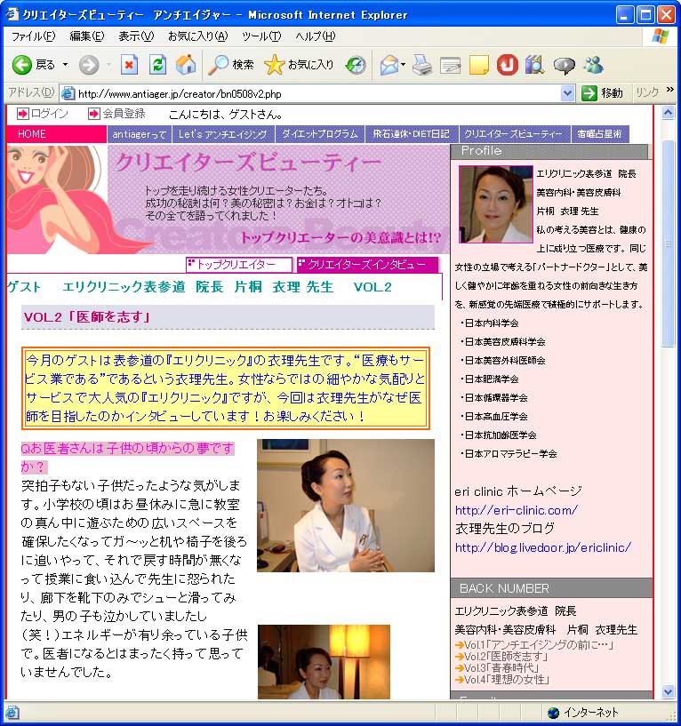 アンチエイジャーの企画「クリエイターズビューティ」ゲストとして4回に渡り、衣理クリニック表参道(エリクリニック)院長 片桐衣理のインタビュー記事が掲載されました。第2回のテーマは「医師を志す」です。