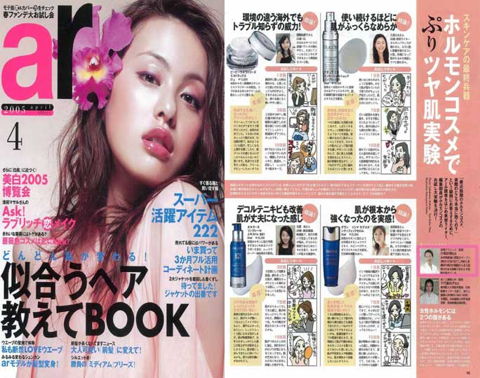 「ar4月号」の企画「ホルモンコスメでぷりツヤ肌実験」として女性ホルモン、成長ホルモンについての基本的な知識(いつ分泌されて、どう私たちに作用するのか、肌との関係について)と、今多く登場しているホルモンコスメといわれている化粧品についての見解、効能について日常生活で気をつけたいこと等を衣理クリニック表参道(エリクリニック)院長 片桐衣理が紹介しています。