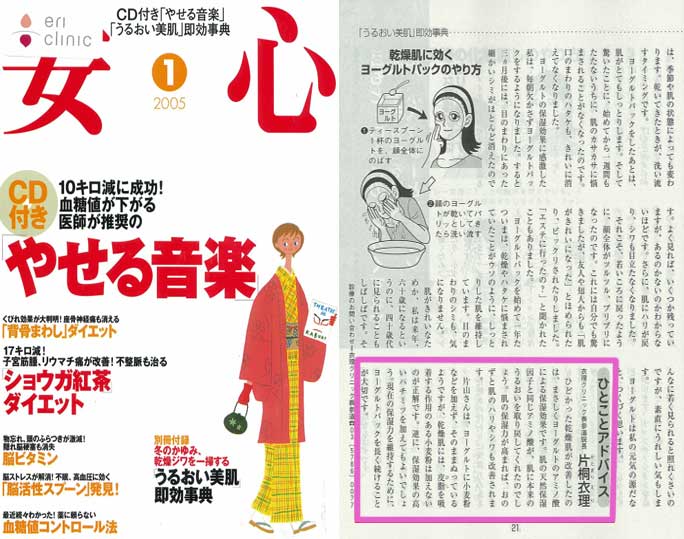 「MISS1月号」の企画「2005年のアンチエイジング最前線!」に、「人気クリニックの最新アンチエイジング情報」として、衣理クリニック表参道(エリクリニック)、及びアイクリアーXLが紹介されました。