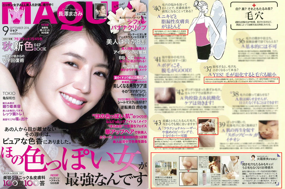 『MAQUIA』9月号、「美容クリニック&皮膚科 誌上カウンセリング100問100等」にて、衣理クリニック表参道院長が、お肌とボディの悩みや疑問についてコメントさせていただきました。また、毛穴のお悩みに当院の「毛穴スリムレーザー」をご紹介いただきました。是非、ご覧くださいませ。
