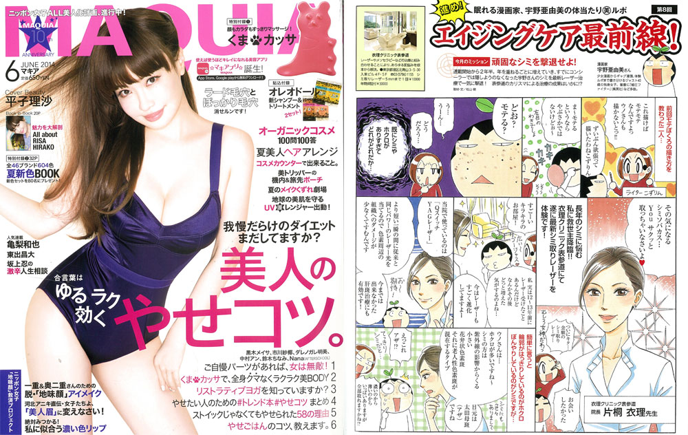 『MAQUIA』6月号、「エイジングケア最前線!」にて、衣理クリニック表参道の「シミ取りレーザー」が紹介されました。漫画家の宇野亜由美さんが体験され、その様子を漫画で掲載くださっています。