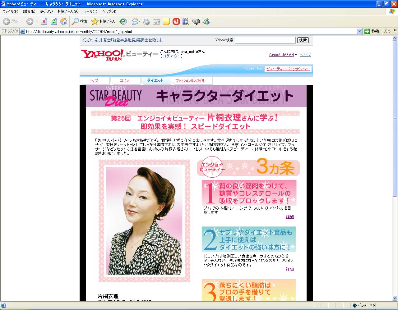 「Yahoo!ビューティー」内ダイエット企画「キャラクターダイエット」の中で、衣理クリニック表参道(エリクリニック)院長 片桐衣理がダイエット法やボディキープの秘訣を紹介しています。