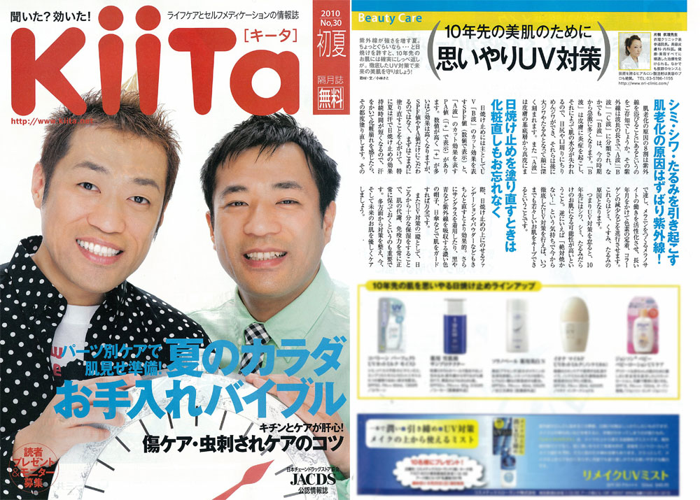 ドラックストア情報誌『KiiTa』初夏号、「10年先の美肌のために思いやりUV対策」にて、衣理クリニック表参道院長 片桐衣理が、肌老化の原因になる紫外線とUV対策についてコメントさせて頂きました。ぜひ、ご覧下さいませ。