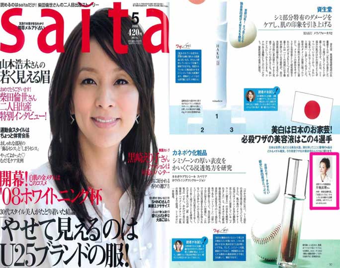 「saita5月号」企画「開幕!’08ホワイトニング杯」の中で、衣理クリニック表参道(エリクリニック)院長 片桐衣理が4つの国産ブランドの美白コスメについて「ワザありポイント」をコメントしています。