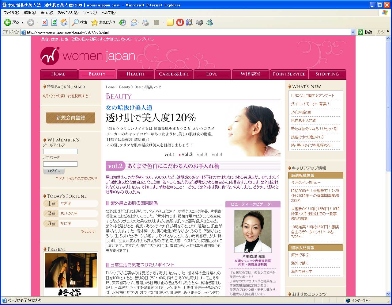 「ウーマンジャパンドットコム」ビューティ企画「透け肌で美人度120%」vol.2の中で、衣理クリニック表参道(エリクリニック)院長 片桐衣理が「紫外線とお肌の因果関係」や「紫外線対策」について解説しています。