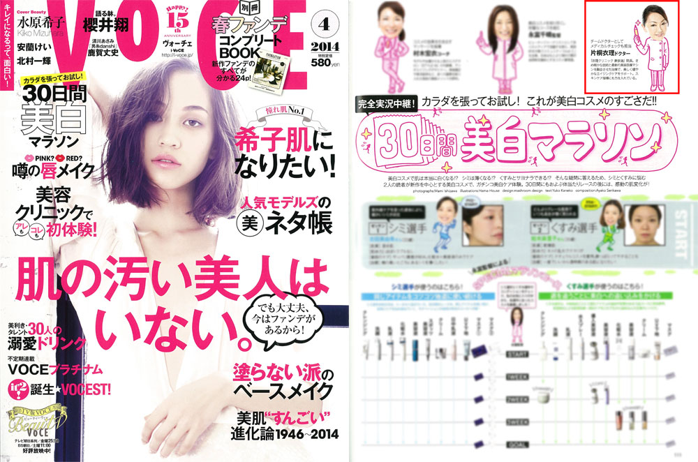 『VoCE』4月号、「30日間美白マラソン」にて、衣理クリニック表参道院長 片桐衣理が、シミやくすみの原因、美白コスメを効かせる方法等についてコメントさせて頂きました。また、美白ケア体験をされた読者の使用後のお肌について、改善しているポイントやアドバイスをさせて頂きました。是非、ご覧下さいませ。