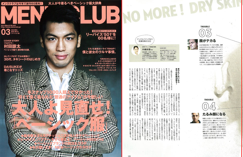 『MEN’S CLUB』3月号、「肌の最大の敵“乾燥”に勝つ!」にて、衣理クリニック表参道院長 片桐衣理が、乾燥が肌に及ぼす影響とその対策法などについてコメントさせて頂きました。