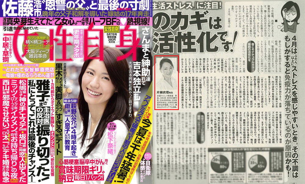 『女性自身』5月7日号、【免疫力アップのカギは「NK細胞」の活性化です!】にて、衣理クリニック表参道院長 片桐衣理が、新生活ストレスの原因や、対策法について、また、NK細胞についてコメントさせて頂きました。是非、ご覧下さいませ。