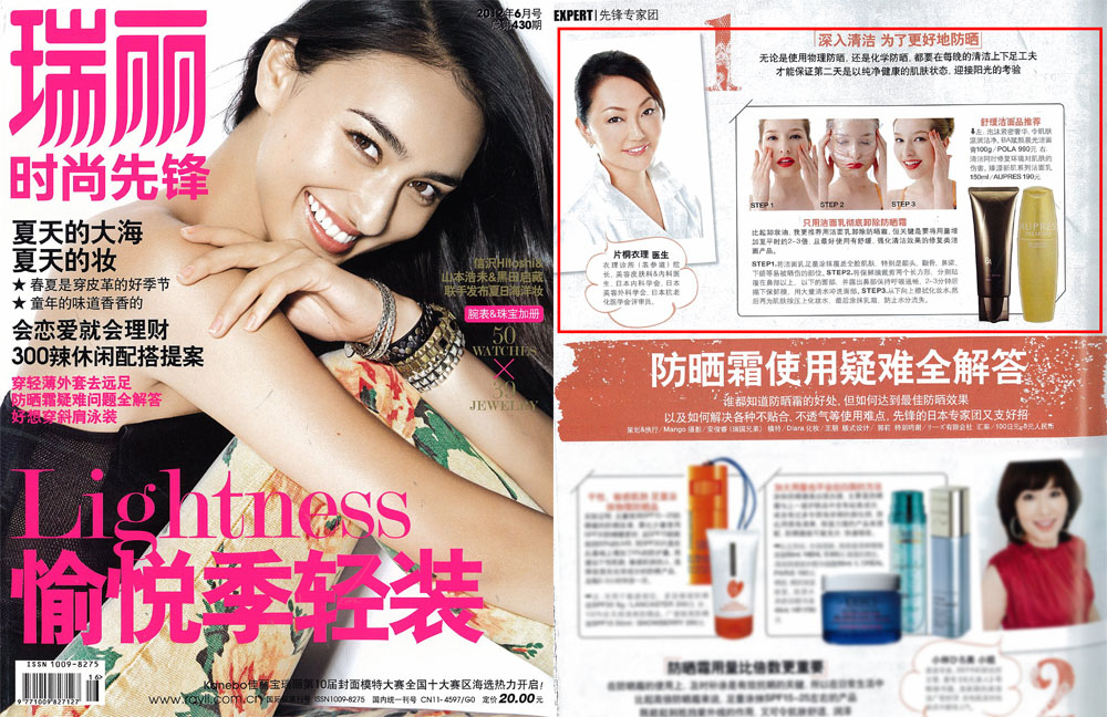 中国版GLAMOROUS『瑞麗時尚先鋒』6月号にて、衣理クリニック表参道院長 片桐衣理が、落ちにくい日焼け止めのクレンジング法と注意点についてコメントさせて頂きました。是非、ご覧下さいませ。