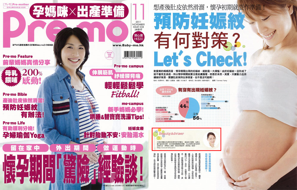 FirstPre-mo2012年版『妊娠初期に読む本』、【妊娠線予防 私の秘策、教えます!】にて、衣理クリニック表参道院長 片桐衣理が「妊娠線のできるメカニズム、つくらないための保湿ケア」等についてアドバイスさせていただいた記事が台湾版「Permo11月号」に掲載しました。