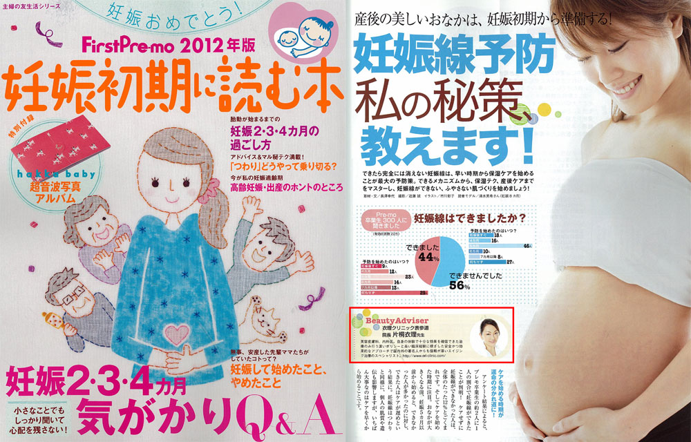 FirstPre-mo2012年版『妊娠初期に読む本』、【妊娠線予防 私の秘策、教えます!】にて、衣理クリニック表参道院長 片桐衣理が「妊娠線のできるメカニズム、つくらないための保湿ケア」等についてアドバイスさせていただきました。是非、ご覧下さいませ。