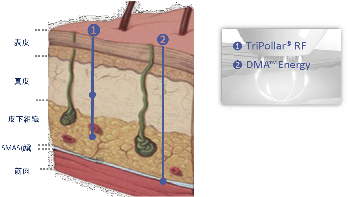 高周波(RF)と局所電気刺激(動的筋肉活性化:DMA)の2つのエネルギーで、表皮・真皮・皮下組織・筋肉の4層を同時に刺激します。シワ・たるみ・部分痩身といった悩みに素早くアプローチ。