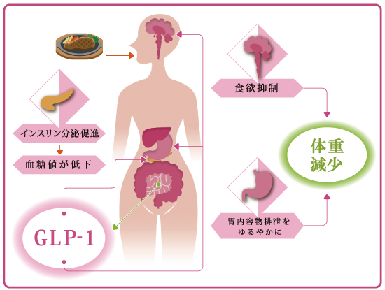 また膵臓以外にも、脳や胃へと作用し食欲を抑え、食べる量をコントロールすることができます。
