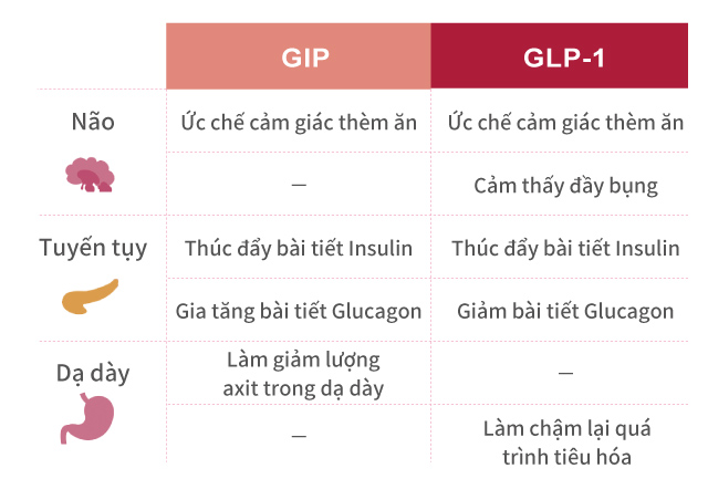 Tiêm GIP/GLP-1 bao gồm cả tác dụng của GIP và GLP-1, trong khi tiêm GLP-1 chỉ có tác dụng của GLP-1 trong hormone đường tiêu hóa, giúp thúc đẩy bài tiết Insulin.