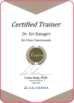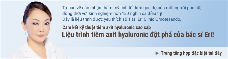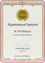Chính viện trưởng Eri Katagiri, người có kinh nghiệm hơn 150 ngàn ca tiêm truyền cả trong và ngoài nước, được công nhận có tay nghề tiêm axit hyaluronic chuyên nghiệp bởi công ty Galderma, đồng thời được công nhận là bác sĩ chỉ đạo kỹ thuật cho các bác sĩ chuyên ngành tiêm truyền thẩm mỹ trong Nước sẽ là người đích thân thực hiện từ khâu tư vấn đến khâu điều trị.